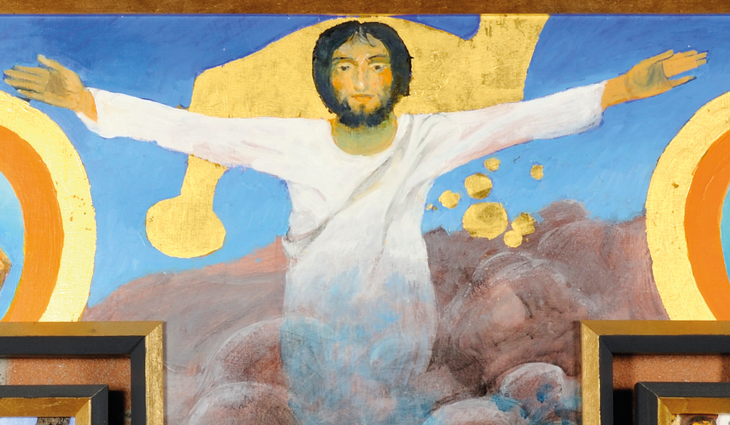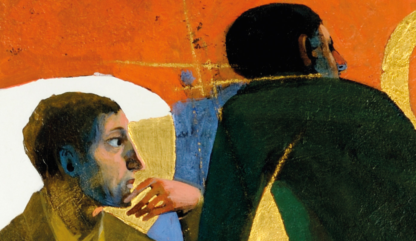 L’immagine che ci regala Arcabas alla conclusione del ciclo di Emmaus è incredibile. Una sedia vuota rovesciata a terra, la porta lasciata spalancata, la tovaglia messa alla rinfusa, tutti elementi che mostrano visivamente a primo impatto la fretta dei discepoli che dovevano velocemente tornare a Gerusalemme.