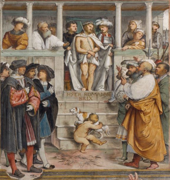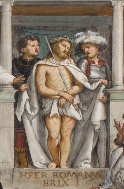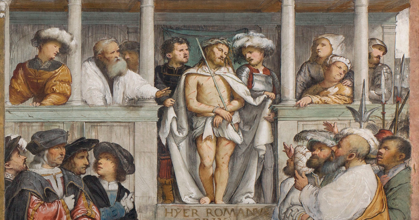 Dopo aver meditato il vangelo di Giovanni 19,1-16 osserva questo affresco del Romanino che rappresenta Gesù fatto prigioniero ed esposto al pubblico dopo essere stato flagellato e umiliato da alcuni soldati. Le guardie che lo accompagnano scostano i lembi del suo mantello insanguinato e mostrano alla gente il suo corpo svestito e coperto di ferite. Il "Re dei giudei" ha una canna come scettro e dei rami spinosi intrecciati come corona.