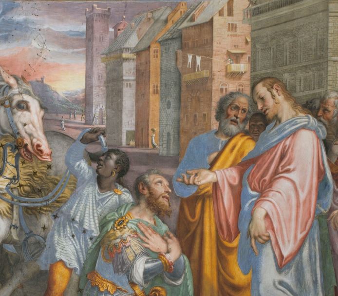 Il pittore Giulio Campi ha ambientato il dipinto “Incontro di Gesù con il centurione” sulla soglia di un centro abitato tipico della sua epoca, gli ultimi decenni del ‘500. Osserva le costruzioni sullo sfondo: c’è una torre, vecchie palazzine medievali e un palazzo più moderno, in stile rinascimentale. Una donna si sporge per stendere i panni da una terrazza, un’altra per strada trasporta una cesta sulla testa.