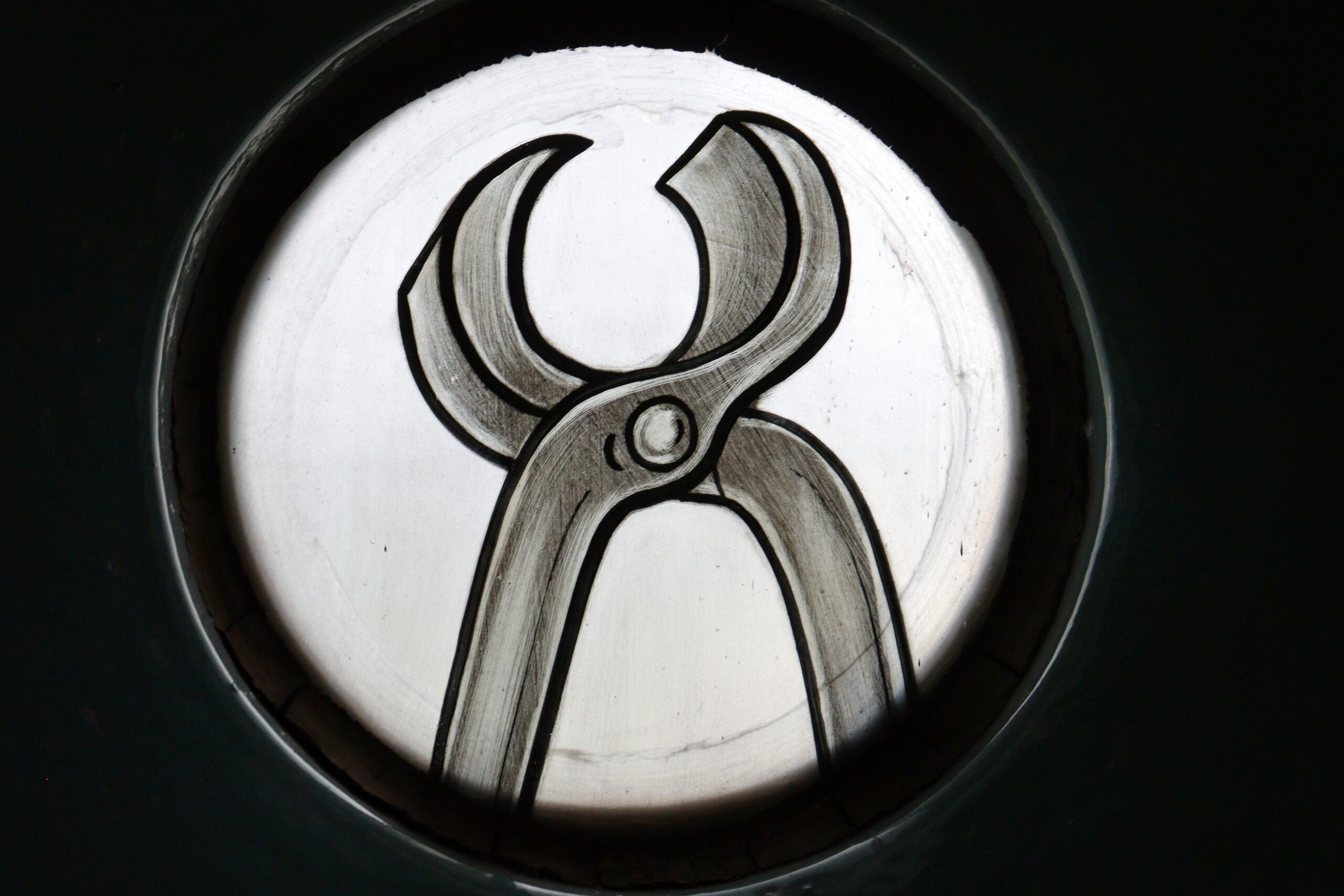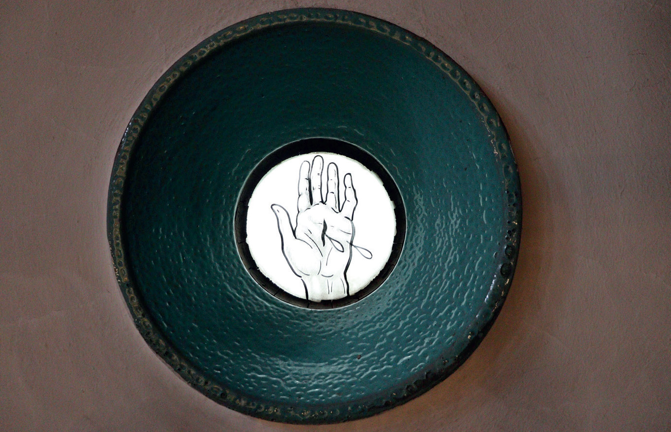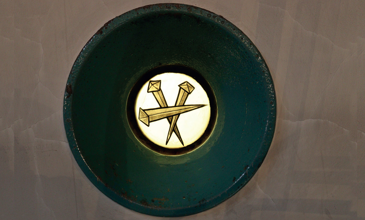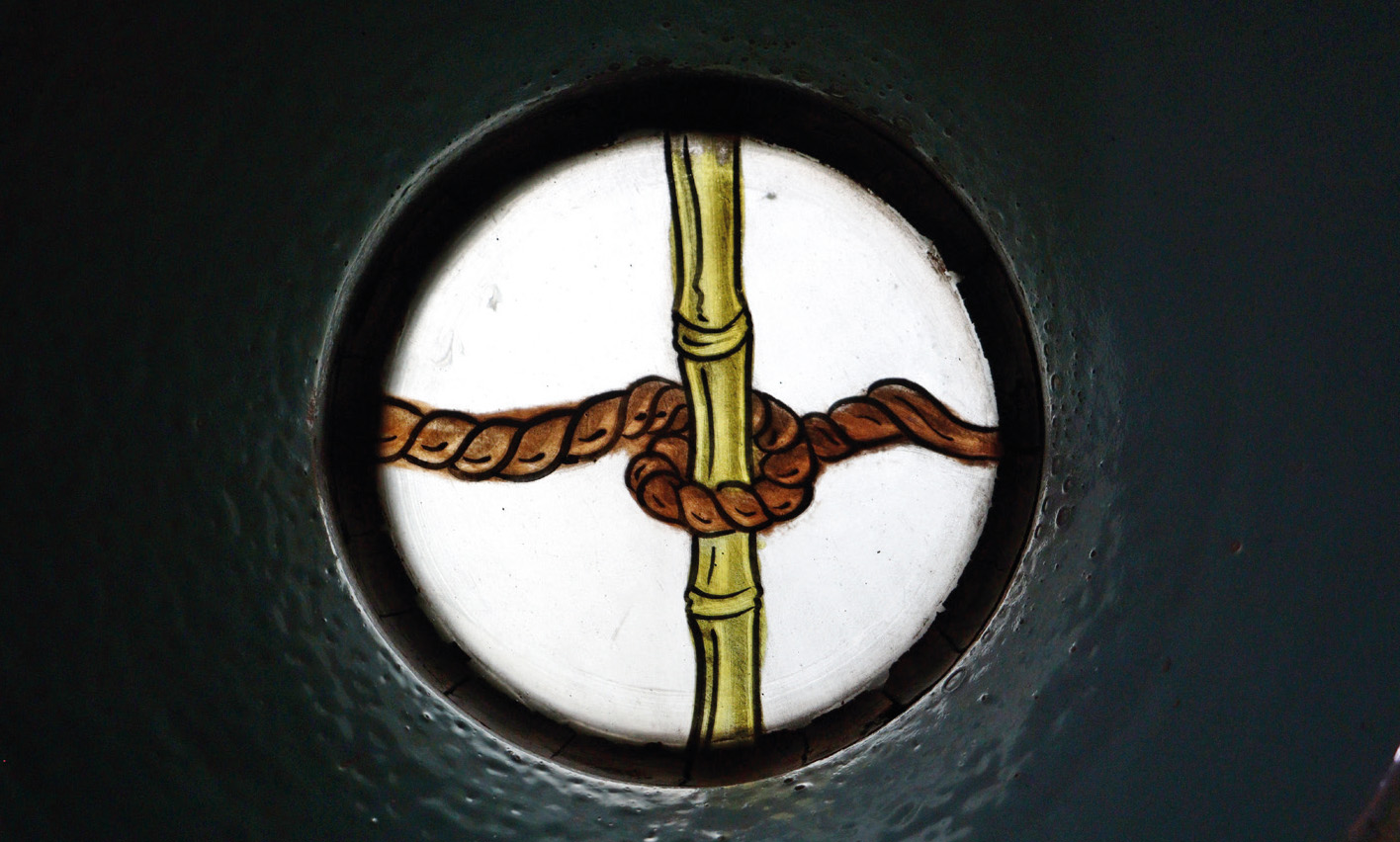 Tra i cento piccoli oculi che punteggiano la facciata della chiesa di Sant’Alberto Magno a Padova, un vetro istoriato raffigura una canna e una corda, segni semplici della Passione di Cristo.